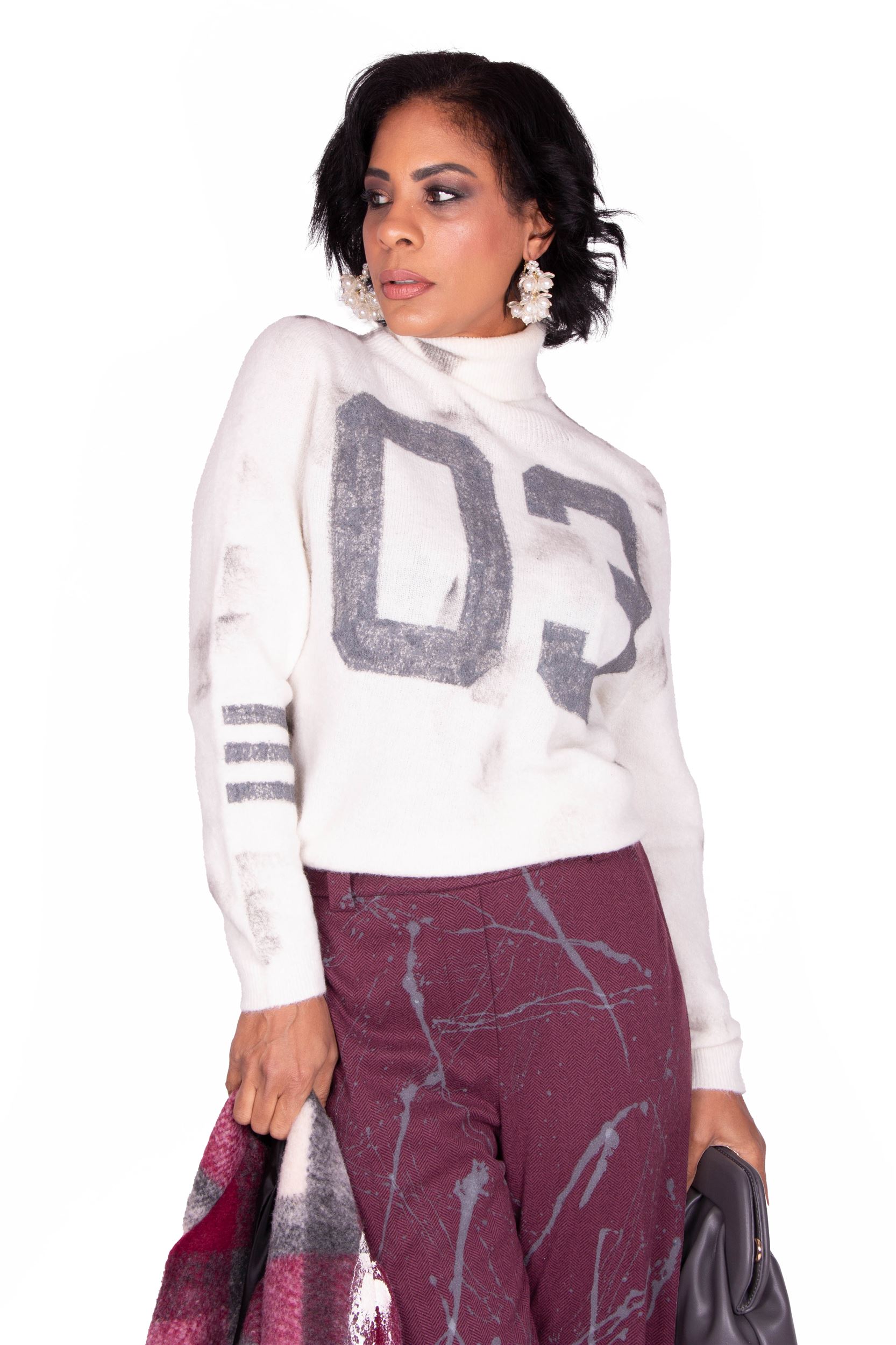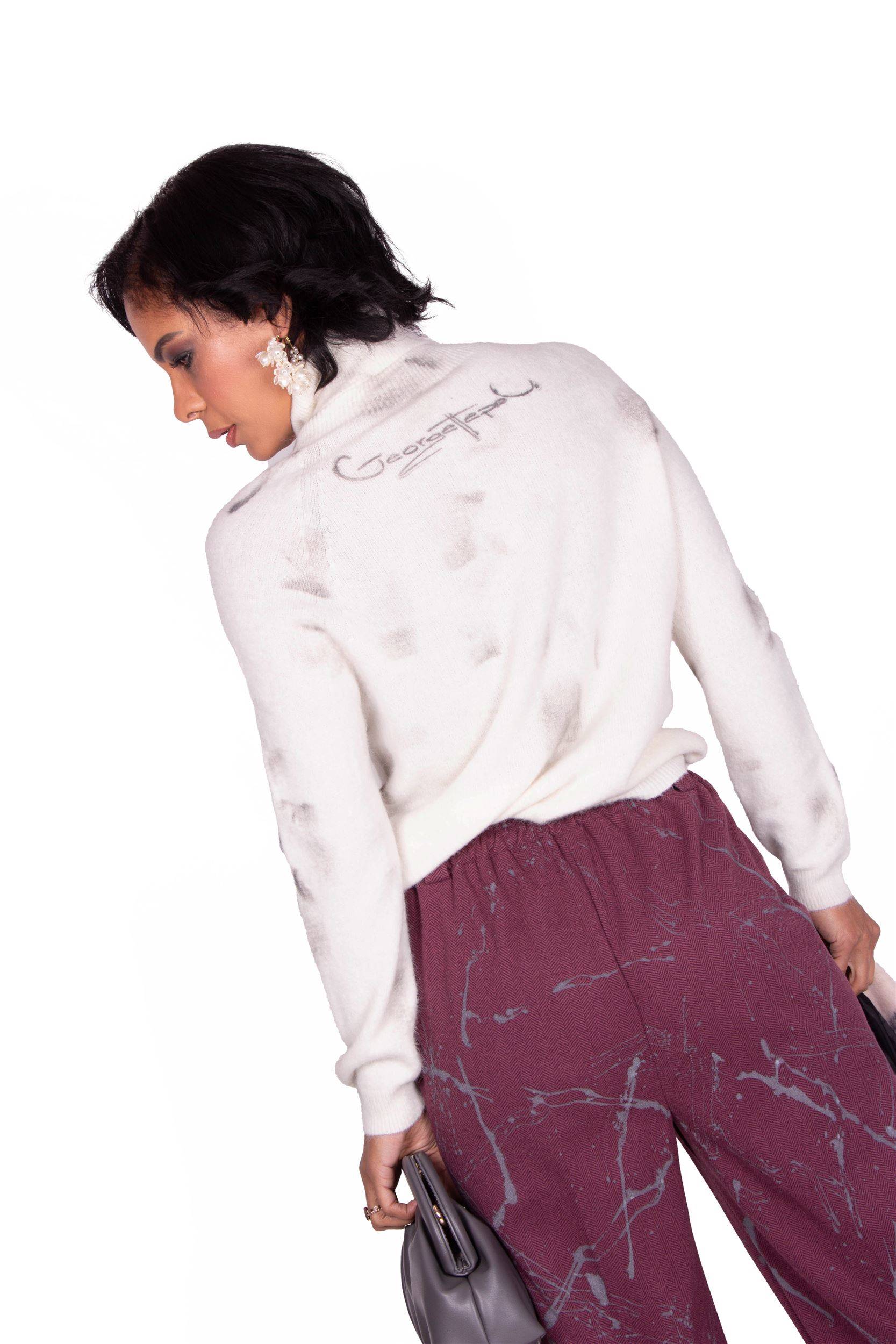MAGLIONCINO BIANCO A COLLO ALTO CON PERSONALIZZAZIONE 03 DI COLORE GRIGIO REALIZZATA A MANO CON COLORI AD ACQUA ANALLERGICI E SERIGRAFICI