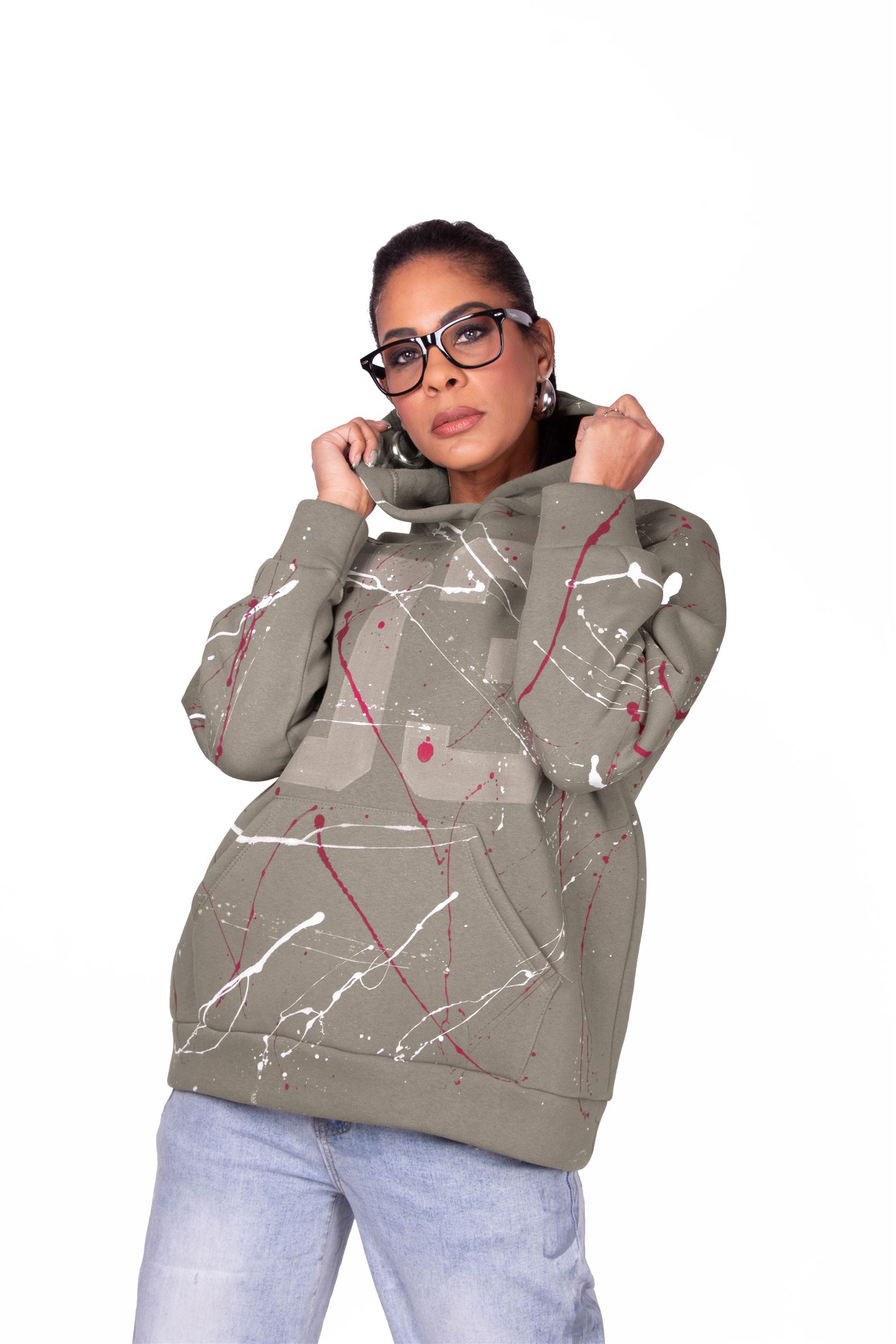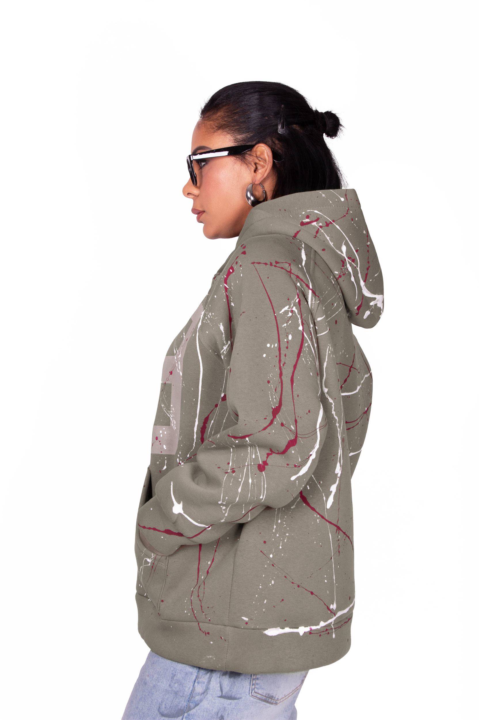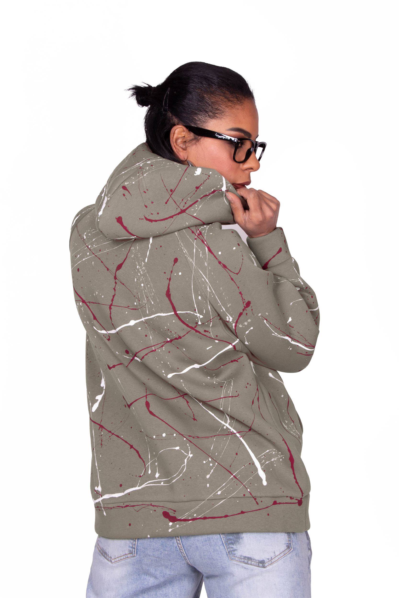 FELPA COLOR SABBIA CON CAPPICCIO E TASCA FRONTALE, PERSONALIZZAZIONE 03 DI COLORE BEIGE CON SCHIZZI VINACCIA E BIANCO REALIZZATA A MANO CON COLORI AD ACQUA ANALLERGICI E SERIGRAFICI